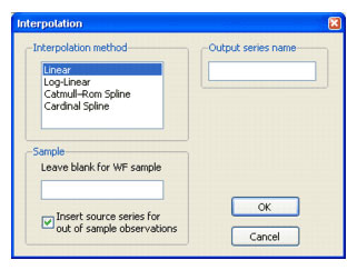 EViews 7¿¡¼´Â ´©¶ôµÈ °ªÀ» ä¿ì±â À§Çؼ º¸°£ ½Ã¸®Á Á¦°øÇÕ´Ï´Ù. EViewsÀÇ º¸°£À» ¼öÇàÇϱâ À§Çؼ´Â ´ÙÀ½°ú °°Àº ´Ù¾çÇÑ ¾Ë°í¸®ÁòÀ» Á¦°øÇÕ´Ï´Ù : ¼±Çü, ·Î±×-¼±Çü, Catmull-Rom Spline°ú Cardinal Spline.