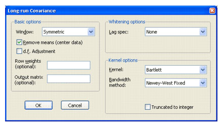 EViews´Â ±×·ì °´Ã¼ÀÇ ´ÜÀÏ ½Ã¸®Á ¸ðµç ½Ã¸®ÁîÀÇ Àå±â °øºÐ»ê(ºÐ»ê) Çà·ÄÀ» ÀúÀåÇϱ⿡ Æí¸®ÇÑ µµ±¸¸¦ Á¦°øÇÕ´Ï´Ù. ºñ¸ð¼öÀû ÇÙ(Newey-West 1987, Andrews 1991), ¸ð¼öÀû VARHAC (Den Haan and Levin 1997)°ú »çÀü¹é»öÈ ÇÙ(Andrews and Monahan 1992) ¹æ¹ýÀ» »ç¿ëÇÏ¿© ´ëĪÀû ¶Ç´Â ÀϹæÀûÀÎ Àå±â °øºÐ»êÀ» °è»êÇÒ ¼ö ÀÖ½À´Ï´Ù. ¶ÇÇÑ EViews´Â ÇÙ ÃßÁ¤À» À§ÇÑ Andrews (1991) ¿Í Newey-West (1994) ÀÚµ¿ ´ë¿ªÆø ¼±Åùý°ú VARHAC¿Í »çÀü¹é»öÈ ÃßÁ¤À» À§ÇÑ ½ÃÂ÷ ±æÀÌ¿¡ ±â¹ÝÇÑ Á¤º¸ ±âÁØ ¼±ÅùýÀ» Áö¿øÇÕ´Ï´Ù.