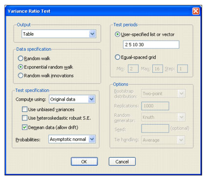 EViews 7¿¡¼´Â ±âº»ÀûÀ¸·Î ºÐ»êºñ °ËÁ¤ ±â´ÉÀÌ Æ÷ÇԵǾî ÀÖ½À´Ï´Ù. ºÐ»êºñ °ËÁ¤ ºä¿¡¼´Â Lo and MacKinlay ºÐ»êºñ °ËÁ¤À» ¼öÇàÇÏ¿© ½Ã¸®Áî°¡ ¹«»ó°üÀÎÁö, ¶Ç´Â È®·ü º¸ÇàÀ̳ª ¸¶ÆÃ°ÔÀÏ ¼ºÁúÀ» µû¸£´Â Áö ¿©ºÎ¸¦ È®ÀÎÇÒ ¼ö ÀÖ½À´Ï´Ù.