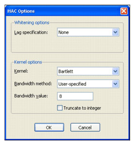 ´õ¿í Áß¿äÇÑ °ÍÀº È®ÀåµÈ ¹üÀ§ÀÇ HAC °øºÐ»ê ¿É¼ÇÀÇ µ¶¸³ ½ÇÇàÇü °øºÐ»ê °è»êÀ» ¹Ý¿µÇϰí ÀÖ´Ù´Â °ÍÀÔ´Ï´Ù. ºñ¸ð¼öÀû ÇÙ(Newwy-West 1987,Andrews 1991), ¸ð¼öÀû VARHAC(Den Haan and Levin 1997)¿Í »çÀü ¹é»öÈ ÇÙ(Andrews and Monahan 1992)¹æ¹ýÀ» »ç¿ëÇÏ¿© ´ëĪ ¶Ç´Â Àå±â °øºÐ»êÀ» °è»êÇÒ ¼ö ÀÖ½À´Ï´Ù. Ãß°¡·Î EViews´Â ÇÙ ÃßÁ¤ ¹× VARHAC¸¦ À§ÇÑ ½ÃÂ÷ ±æÀÌ ¼±Åùý¿¡ ±â¹ÝÇÑ Á¤º¸ Ç¥Áذú »çÀü ¹é»öÈ ÃßÁ¤À» À§ÇÑ Andrews(1991)¿Í Newey-West(1994)ÀÇ ÀÚµ¿ ´ë¿ªÆø ¼±ÅùýÀ» Áö¿øÇÕ´Ï´Ù. ÀÌ·¯ÇÑ »õ·Î¿î ¿É¼ÇÀº ¹æÁ¤½Ä ´ëÈ»óÀÚÀÇ ¿É¼Ç ÆäÀÌÁöÀÇ °è¼ö °øºÐ»ê Çà·Ä ÄÞº¸¹Ú½º¿¡¼ HAC¸¦ ¼±ÅÃÇϰí HAC¿É¼Ç ´ÜÃ߸¦ ´©¸£¸é ãÀ» ¼ö ÀÖ½À´Ï´Ù.