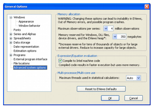 »ç¿ëÀÚ ÁöÁ¤ ¼³Á¤À» ÀÌ¿ëÇÏ·Á¸é EViewsÀÇ ¸ÞÀÎ ¸Þ´º¿¡¼ Options/General Options ´ëÈ»óÀÚ·Î À̵¿ÇϽʽÿÀ. Åë°è ¿¬»êÀ» ó¸®ÇÒ ¶§ ½º·¹µå ¼ö¸¦ ÃÖ´ë·Î ÁöÁ¤ÇÏ·Á¸é Multi-processor/Multi -core use ¼½¼Ç¿¡¼ ÁöÁ¤ÇÒ ¼ö ÀÖ½À´Ï´Ù. EViews´Â ÇÁ·Î¼¼¼¿Í Äھ µ¿ÀÏÇÏ°Ô Ãë±ÞÇÏ¿© ÀÛµ¿µÇ¸ç ÇÏÀÌÆÛ-½º·¹µå°¡ Æ÷ÇÔµÈ ÇÁ·Î¼¼¼´Â Áö¿øÇÏÁö ¾Ê½À´Ï´Ù. ÀϹÝÀûÀ¸·Î Auto·Î ¼³Á¤ÇÏ¿© »ç¿ëÇϽô °ÍÀÌ ÁÁÀ¸¸ç, Reset to EViews Defaults ¸Þ´º¸¦ Ŭ¸¯Çϸé Ãʱ⠱⺻ ¼³Á¤À¸·Î µ¹¾Æ°¥ ¼ö ÀÖ½À´Ï´Ù.